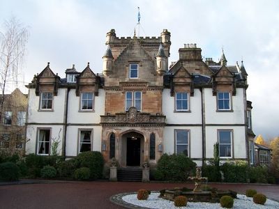 Cameron House staat aan de zuidelijke oever van Loch Lomond binnen 160 hectare bosgebied, met Schotse baroniale architectuur en stenen muren.