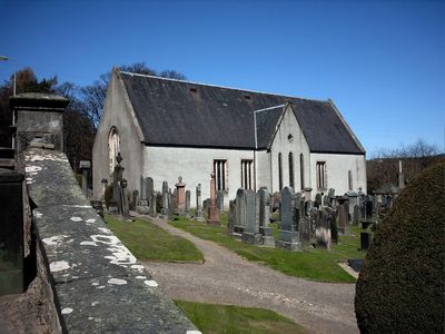 Het kerkterrein bevat een Klasse II Pictische steen uit de zevende tot negende eeuw, met Keltische kruisen en traditionele gravures in het begraafgedeelte.