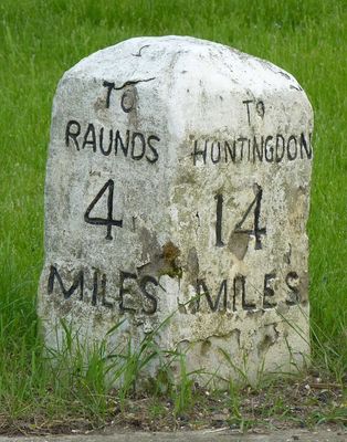 Milestone, Raunds Road, Keyston at jct with The Loop, milestone in Bythorn And Keyston, Huntingdonshire, UK