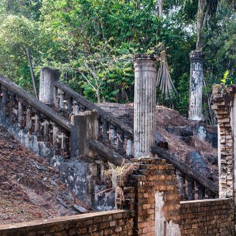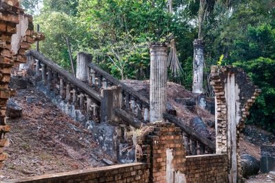 De ruïnes van dit landhuis bevatten 45 deuren, 152 ramen en witte bakstenen muren gebouwd door Indiase architecten met Javaanse arbeiders.