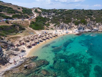 Het Tigania strand heeft drie kleine baaien met goudkleurig zand, gelegen tussen de stranden Klimataria en Kriaritsi aan de oostkust van het schiereiland Sithonia.
