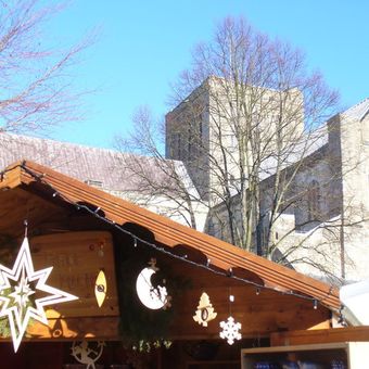 Duitse houten chalets omringen het historische terrein van de Winchester Kathedraal, met feestelijke producten en lokaal handwerk.