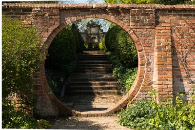 De cirkelvormige bakstenen opening vormt een doorgang tussen verschillende tuingedeelten en omlijst uitzichten op het omringende parklandschap. De structuur bestaat uit zorgvuldig gelegde rode bakstenen die een perfecte cirkel vormen. De poort staat vrij in de tuin en stelt bezoekers in staat erdoorheen te lopen terwijl ze hun perspectief op de beplantingen daarachter veranderen.