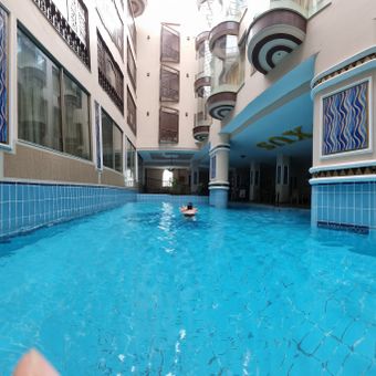 De bioscoop deelt het gebouw met het Luxus Grand Hotel, waardoor hotelgasten directe toegang hebben tot de filmvertoningen.