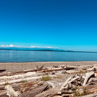 Drijfhoutsculpturen lijnen het noordelijke strandpad van Lincoln Park, met gesneden zeedieren tegen de achtergrond van Puget Sound.