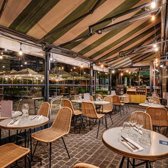 Het restaurant bevindt zich direct bij de ingang van het complex, wat het gemakkelijk maakt om er voor of na een evenement heen te gaan. De ruime indeling met zitplekken binnen en op het terras helpt bij het beheren van de gaststroom, en het kan grotere groepen gemakkelijk herbergen.