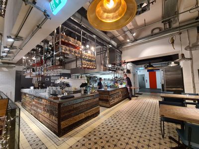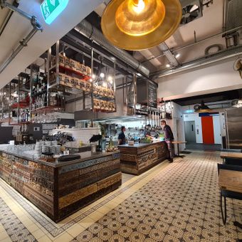 Gevestigd in een voormalige elektriciteitscentrale in München die beschermd is als historisch monument, behoudt het zijn oorspronkelijke industriële architectuur en creëert een onderscheidende eetomgeving.