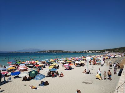 Het strand strekt zich uit over 3 kilometer kustlijn met fijn zand en helder water dat dieptes bereikt van 100 meter vanaf de kust.