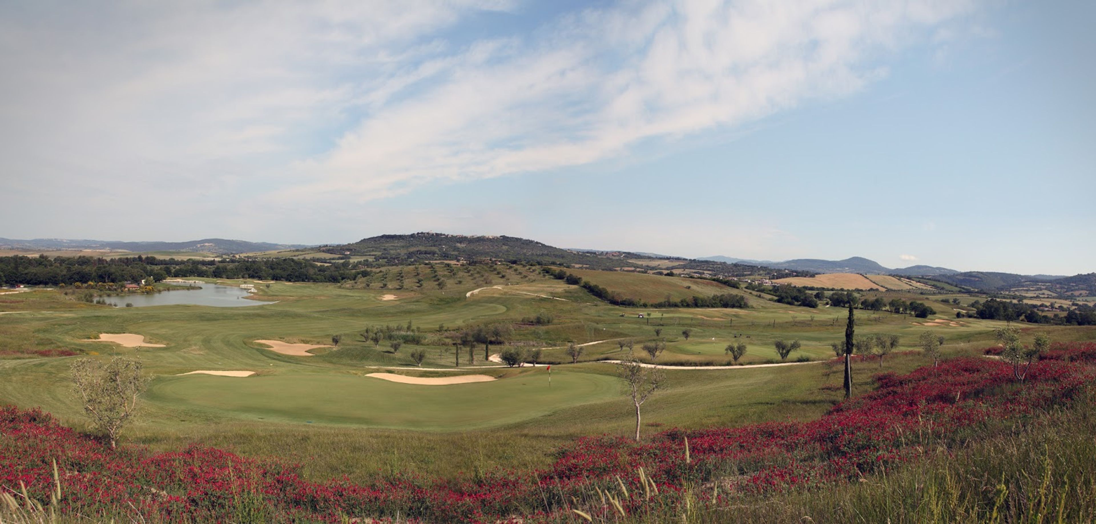 De 18-holes baan strekt zich uit over 70 hectare Toscaans landschap, met 43 driving range afslagplaatsen en gespecialiseerde zones voor verschillende niveaus.