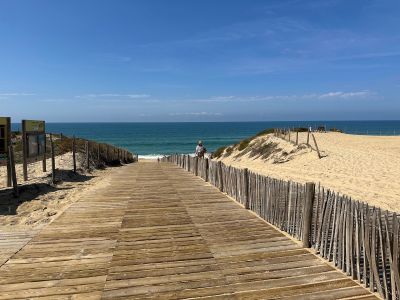 De Plage de l'Horizon strekt zich uit langs de Atlantische kust met fijn zand en natuurlijke duinen die een barrière vormen tussen strand en binnenland.
