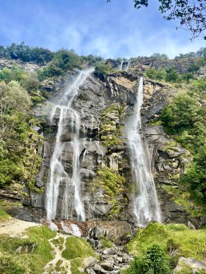 De Cascate dell'Acquafraggia storten naar beneden door twee onderscheidende vallen die ontstaan vanuit de Pizzo Lago op 3.083 meter hoogte, waardoor een spectaculaire 1.800-meter afdaling over ongeveer vijf kilometer door oude gletsjerdalen wordt gecreëerd.