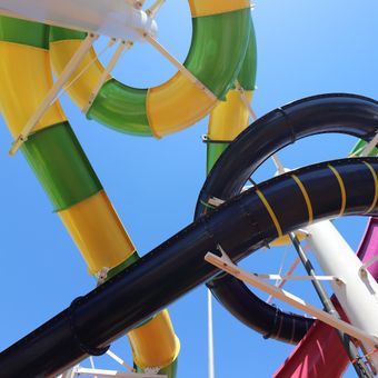De Storm Bowl Riders glijbaan creëert een draaiende beweging die direct naar het centrum van een gigantische cirkelvormige structuur leidt voor de finale plons.