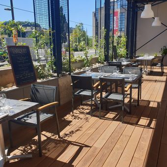 Het restaurant serveert een selectie Franse gerechten, waaronder zeevruchtenplateaus, zuurkool en vlees bereid op de plancha met Elzasser wijnen.