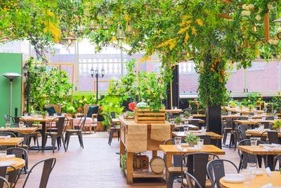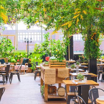 Serra Alpina bevindt zich op de 14e verdieping van Eataly Manhattan, met kas-geïnspireerde decoratie die groenblijvende planten en kleurrijke accenten omvat die een tuinachtige omgeving creëren boven de straten van de stad.