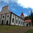 De kerk staat op het zuidelijke punt van het eiland Maré, met een witte buitenkant, een steil dak en een hoekige klokkentoren.