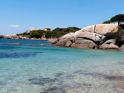 De erosie van lokale granietformaties heeft kenmerkend roze zand langs het water gecreëerd, terwijl mediterrane planten groeien op de omringende rotsen.