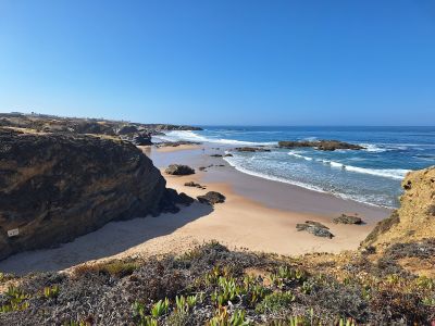 Het strand ligt in het Nationaal Park Zuidwest-Alentejo, waar rotsformaties beschutte gebieden creëren tegen sterke kustwinden.