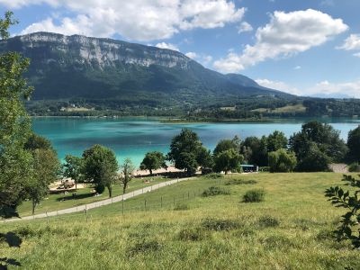 Het strand van het Sougey recreatiecentrum strekt zich uit langs het Aiguebelette-meer met een groen park en directe toegang tot het bergwater.