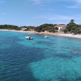 Het 500 meter lange strand strekt zich uit langs helder water, omzoomd door een pijnboombos en rode rotsen aan de oostkust van Sardinië.