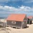 Achter de strandduin staan rijen houten huizen met geschilderde strepen, die zich ontwikkelden van visopslagplaatsen tot vakantieverblijven.