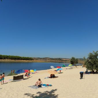 Het strand strekt zich uit over 600 meter zandige kustlijn, met 150 meter bewaakte zwemzone aan het Alqueva-meer.