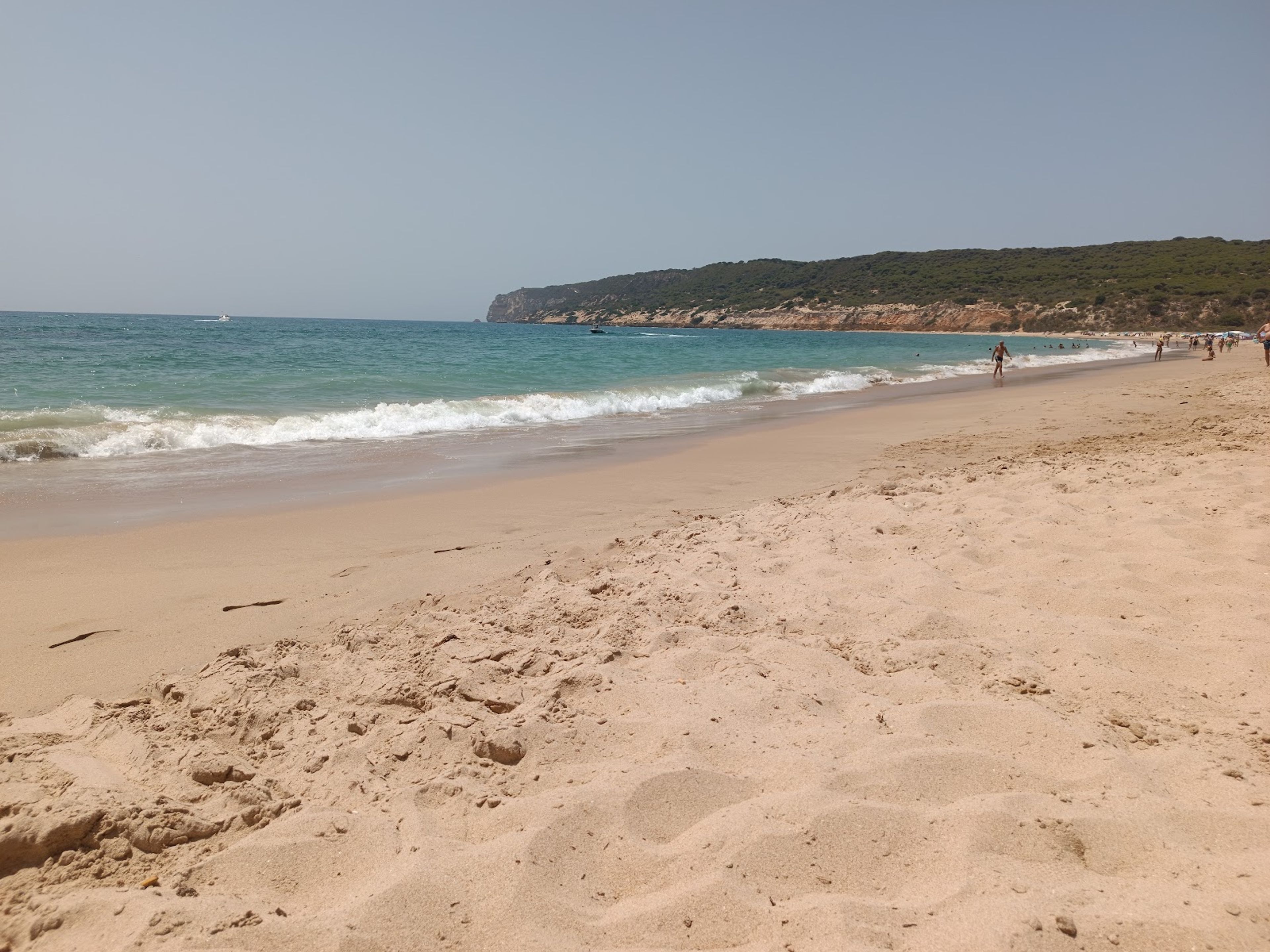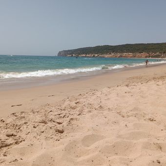 Het 950 meter lange strand combineert wit zand met helder water langs de kust van Barbate, omringd door rotsformaties.
