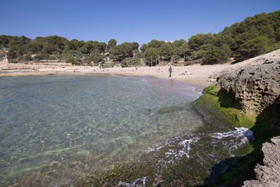 Het 60 meter lange zandstrand heeft helder water en blijft rustig dankzij de semi-stedelijke ligging aan de Costa Dorada.