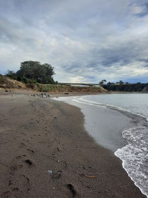 Noyo Beach biedt een zandige kustlijn waar de Noyo River de Stille Oceaan ontmoet, en biedt een beschutte locatie onder de Highway 1 brug met zachte golven geschikt voor wateractiviteiten en ontspanning.