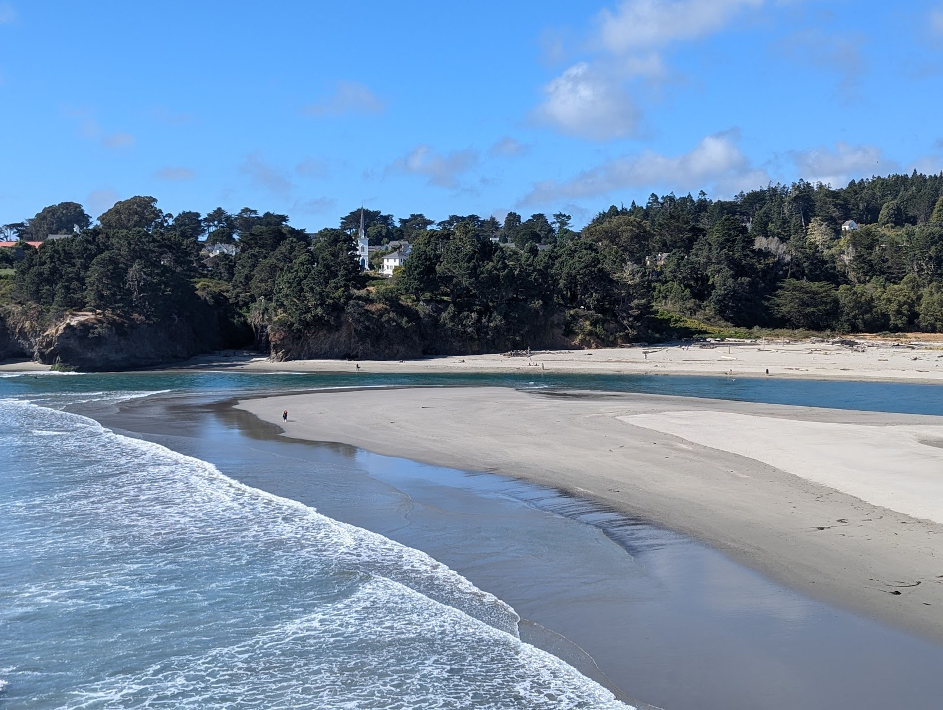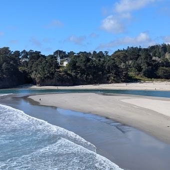 Dit zandstrand ligt op de plaats waar de Big River en de Stille Oceaan samenkomen, en strekt zich uit langs de Californische kust met beboste kliffen.