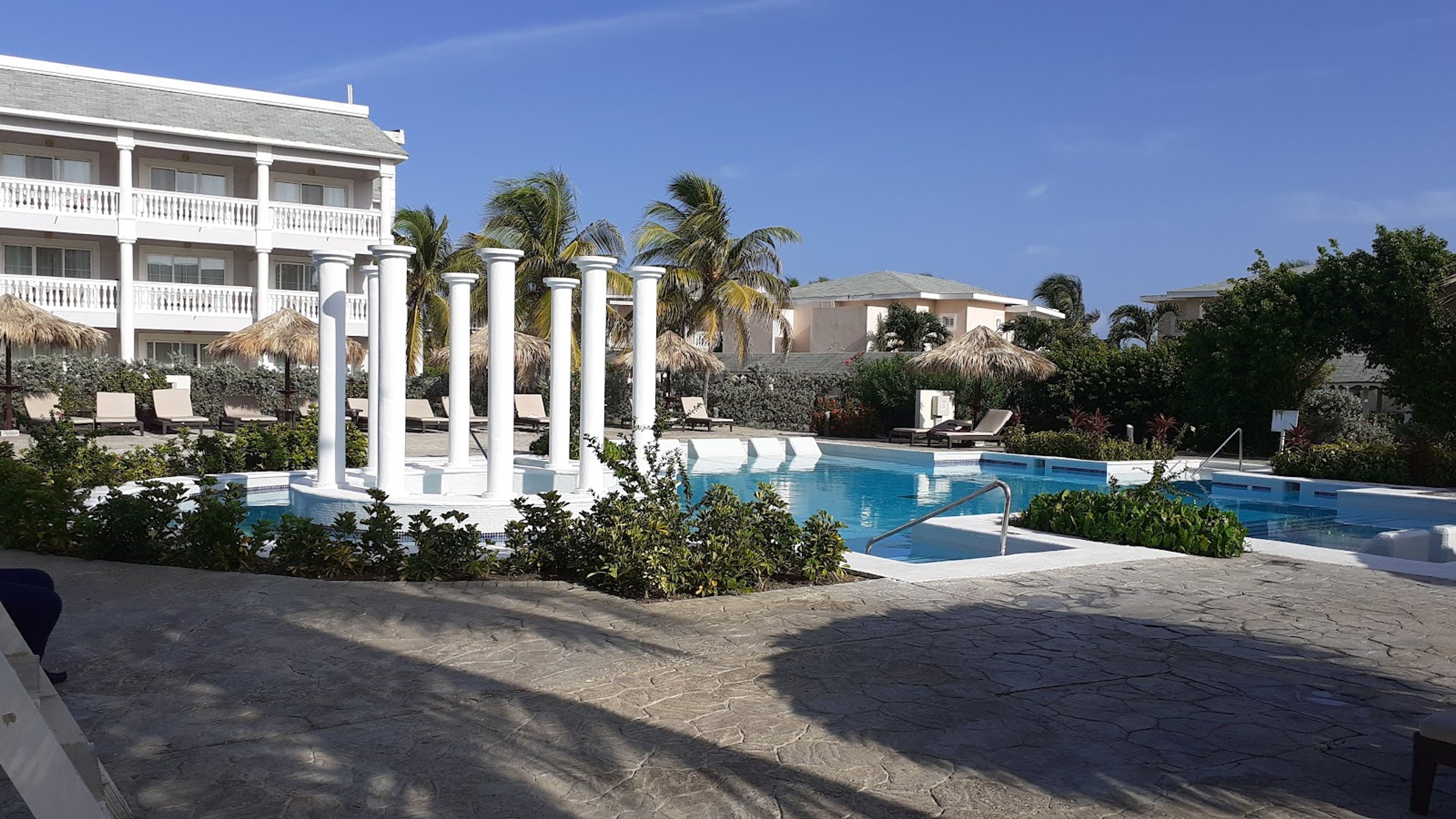 De 500 meter lange kustlijn strekt zich uit langs turquoise water van de Caribische Zee, met zacht goudkleurig zand omzoomd door palmbomen.