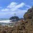 Het strand bestaat uit twee verschillende delen gescheiden door rotsformaties, met natuurlijke zwembaden met blauwgroen water langs de kustlijn.