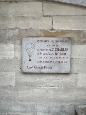 Een bronzen plaat op een stenen voetstuk eert de eerste bemande waterstofballonvlucht van Jacques Charles en Marie-Noël Robert in 1783.