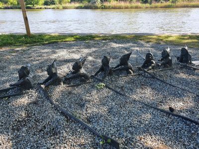 De installatie van Wioślarze zet de traditie voort van dwergbeelden die ontstond uit de anticommunistische Oranje Alternatief beweging in de jaren 1980.