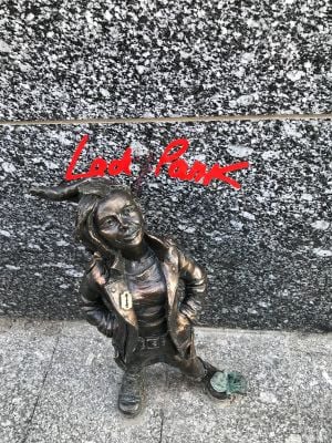 Dit bronzen figuur voegt zich bij meer dan 600 kabouterbeelden in Wrocław, die anticommunistisch verzet verbinden met Poolse rockmuziek.