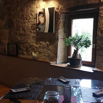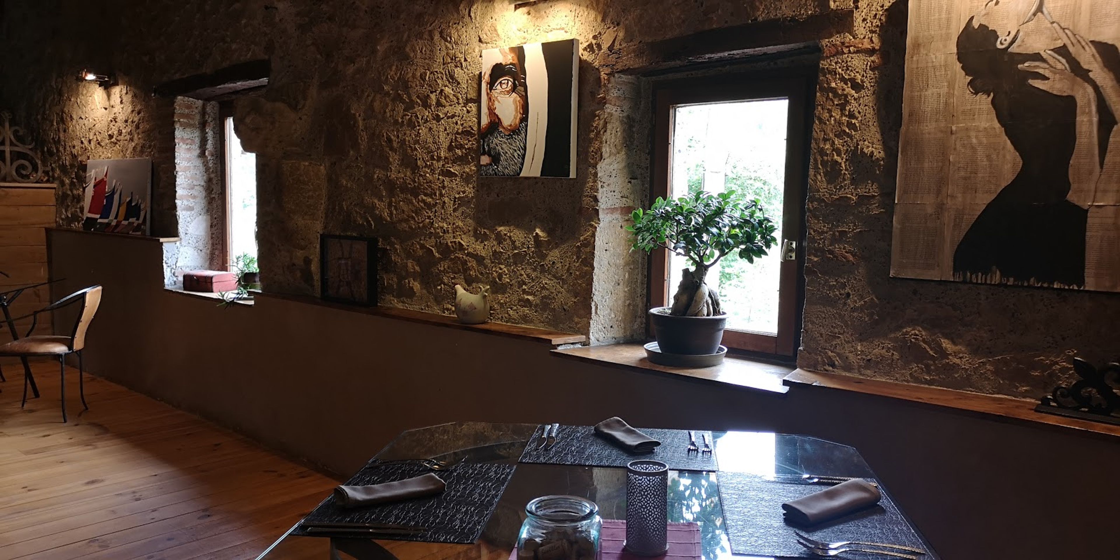 Het restaurant heeft stenen muren, grote ramen en meerdere eetruimtes die moderne en traditionele Franse architecturale elementen combineren.