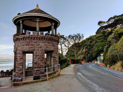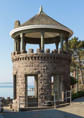De Normandische stenen toren staat nabij Paradise Drive, met uitzicht op Angel Island en de San Francisco Bay met rechthoekige ramen.