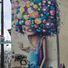 Deze muurschildering toont een groot kind met paarse huid en gesloten ogen. Het haar is een wolk van kleurrijke cirkels en bloemen en het kind draagt een blauwe tuinbroek. De egale muur zorgt dat de kleuren extra opvallen.