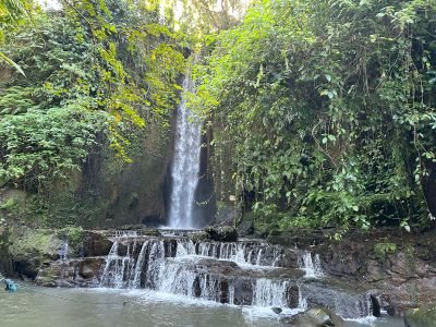 Uma Anyar Waterval stort ongeveer 10 meter naar beneden over twee verschillende niveaus en creëert een natuurlijk zwembad omgeven door weelderige tropische vegetatie en rotsformaties.