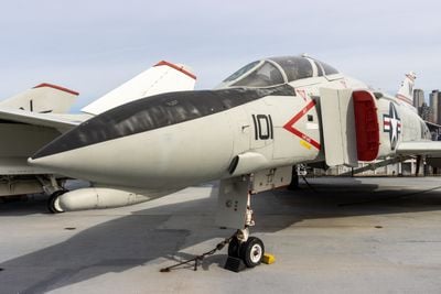 De tentoongestelde F-4N Phantom II is een tweemotorig supersonisch jachtvliegtuig met geveegde vleugels, twee verticale stabilisatoren en kenmerkende marineluchtvaartmarkeringen van vliegdekschepen uit zijn operationele dienstperiode.