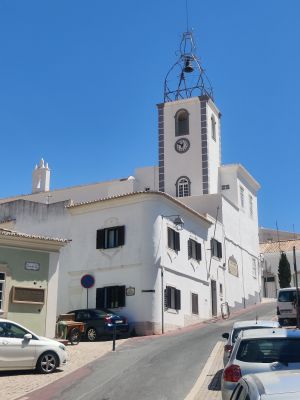 De klokkentoren verheft zich aan de Praça da República met een vierkante stenen structuur die aan elke zijde boogportalen heeft en een traditionele Portugese klok die zichtbaar is vanaf meerdere punten in de historische wijk van Albufeira.