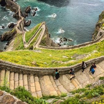 Het Monumento natural de Gaztelugatxe is een kegelvorming rotsformatie die ongeveer 150 meter boven de Cantabrische Zee uitsteekt en via een stenen brug met het vasteland is verbonden. Een kleine kapel op de top wordt bereikt door een zigzagtrap met 241 treden te beklimmen, terwijl de rotsen zelf indrukwekkende bogen en kliffen vertonen die door millennia erosie zijn gevormd.