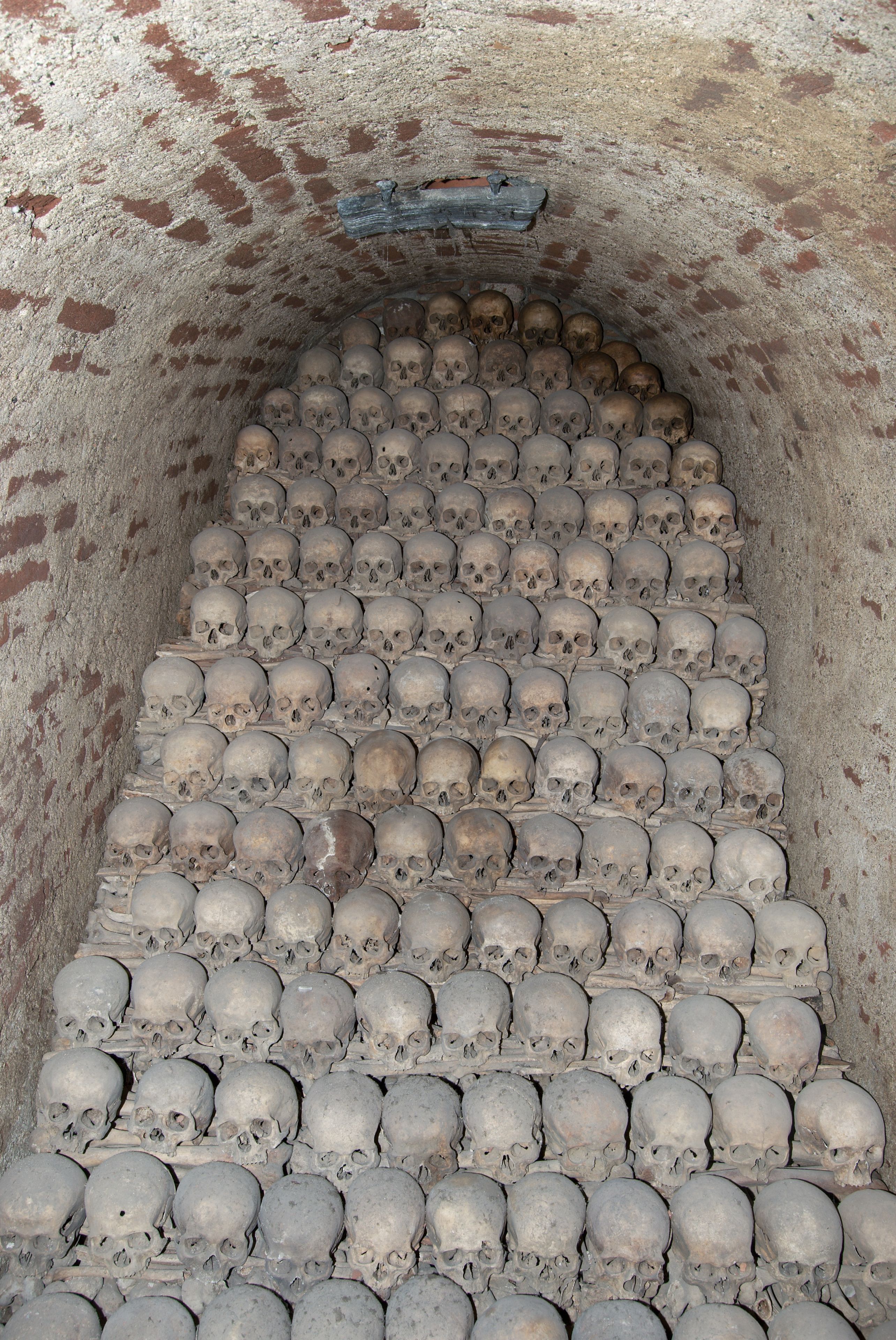 De ondergrondse kamer strekt zich uit over drie met elkaar verbonden ruimtes onder de kerk en bevat systematisch gestapelde menselijke overblijfselen van ongeveer 50.000 personen, gerangschikt in opstellingen van schedels en lange beenderen.