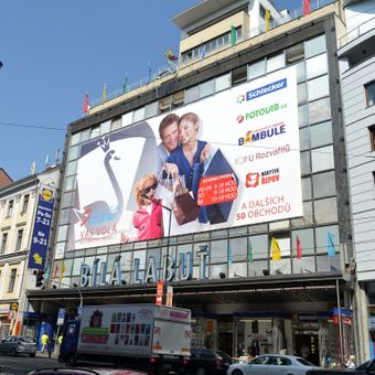 Bílá labuť is een vijfverdiepingenwinkelbedrijf in moderne stijl dat opvalt in Praag. Het gebouw beschikt over een massieve winkelruit met 180 zilvergrijze glaspanelen die bijna 30 meter breed uitstrekt.
