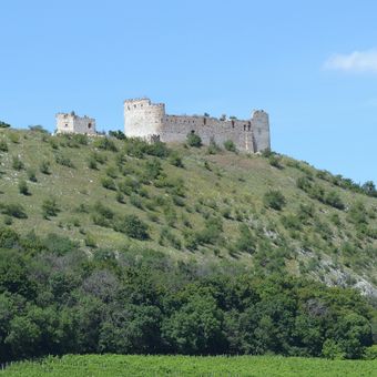Dívčí hrady is een stenen kasteelruïne gelegen op ongeveer 550 meter hoogte op het hoogste punt van de Pavlovheuvels, met uitzicht op het stuwmeer Nové Mlýny en de Oostenrijkse grens. De overblijfselen onthullen de structuur van een middeleeuwse vestingwerk met karakteristieke muren en stenen constructies die de bergtop bepalen.