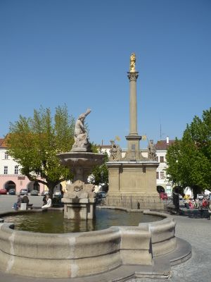 De fontein op het Velké náměstí is een stenen waterwerk met meerdere waterstalen en siersculptuurdetails in het centrum van het plein. Het ontwerp volgt klassieke barokvormen met uitgewerkte details zichtbaar vanuit alle hoeken.