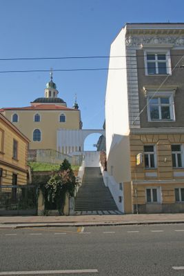 Deze betonnen trap verbindt de Na Kropáčce straat met de Komenského straat, met schone modernistische lijnen, rustplatforms en opvallende veelhoekige lampen die onder een prominente boog hangen.