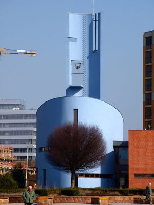 De kerk heeft een ellipsvormig schip met blauwe buitenmuren en integreert moderne architectonische elementen in zijn constructie en ruimtelijke indeling.