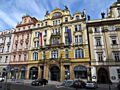 Architect Osvald Polívka voltooide deze financiële instelling in 1901, wat een periode van architectonische ontwikkeling in Praag markeerde.