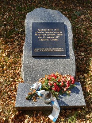 Památník obětem výbuchu v Plzni-Bolevci, pamětní deska na společném hrobu obětí výbuchu muniční továrny Škodových závodů 25. 5. 1917, na boleveckém hřbitově