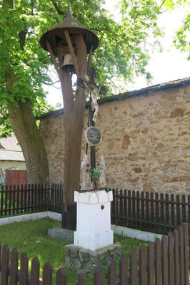 Kříž a zvonička na návsi v Chlístovicích, pamětní kříž v obci Chlístovice, okres Kutná Hora